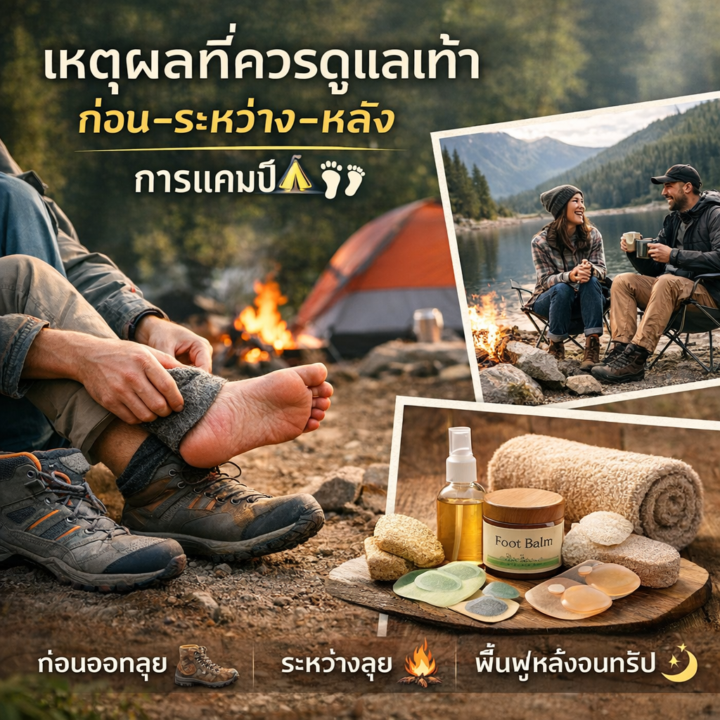 หลายคนเตรียมอุปกรณ์แคมป์อย่างดี เต็นท์ดี รองเท้าแพง เป้พร้อม แต่พอกลับมาถึงบ้านกลับพบว่า…เท้าพอง เท้าแตก กลิ่นอับ ปวดล้า จนทริปที่ควรจะฟิน กลายเป็นทริปที่อยากให้จบเร็ว 😓 นี่คือความจริงที่สายแคมป์จำนวนมากเจอเหมือนกัน แต่ไม่ค่อยมีใครพูดถึงอย่างจริงจัง ทั้งที่ “เท้า” คืออวัยวะแรกที่รับภาระทั้งหมดของการเดิน ลุย และใช้ชีวิตกลางแจ้งตลอดทั้งวัน ในกิจกรรมที่ต้อง “เดิน